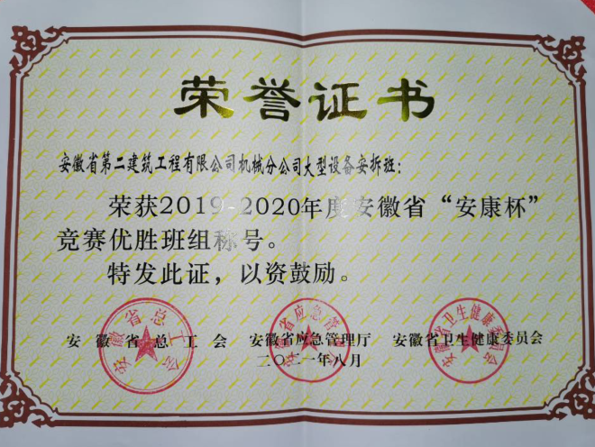 2019-2020年“安康杯”優勝競賽班組--安徽二建機械分公司安拆班