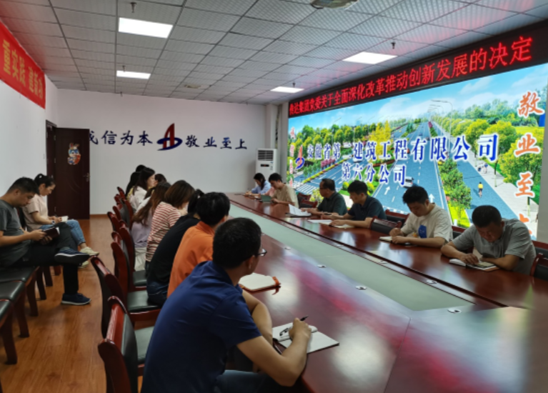 第六公司黨支部傳達學習安徽建工集團全面深化改革推動創新發展動員部署暨主題教育黨課報告會精神。會議要求,一要提高政治站位,統一思想認識,充分認識到集團深化改革推動創新發展是一項意義重大、影響深遠的綜合性改革,是集團在新起點上,把握新形勢新要求,謀劃新思路新發展的舉措,要全面貫徹落實建工控股黨委的決策部署,認真把握集團全面深化改革推動創新發展的歷史使命;二要緊緊圍繞集團戰略部署和工作安排,進一步樹立為集團大發展、轉型發展、高質量發展作貢獻的責任和擔當意識;三要認真落實集團工作安排,進一步做好市場開拓,搶抓市場先機,持續推進項目標準化建設,嚴格落實集團、公司各項規定,樹牢風險意識,做到“五個嚴”,持續推動公司改革轉型、高質量發展。