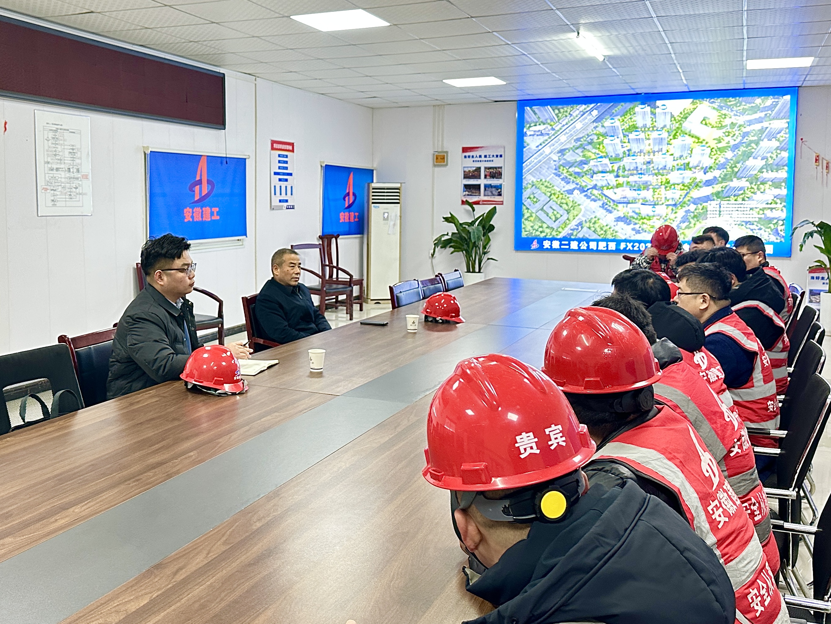 在二建肥西FX202234號地塊項目部,徐文聯帶隊開展了2024年安徽建工春節“送溫暖”走進項目部慰問活動,向堅守一線崗位的項目管理人員和工人派發節日慰問品,對大家一年以來的辛苦工作表示感謝,并送上新春誠摯的祝福和問候。