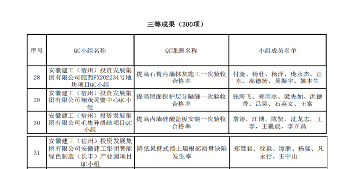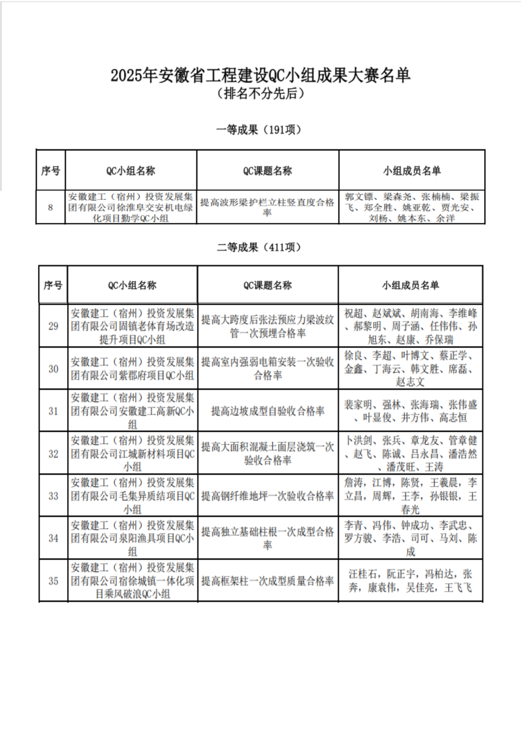 近日,安徽省建筑工程質量與安全協會公布了2025年安徽省工程建設QC小組成果大賽獲獎名單,宿州投發在本次大賽中脫穎而出,共獲得一等成果1項、二等成果7項、三等成果4項。此次獲評多個獎項,充分展現了公司在工程建設領域的創新實力以及技術水平。