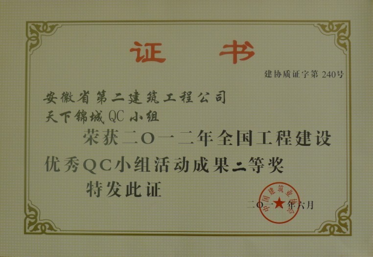 近日,從2012年度全國工程建設優秀質量管理(QC)小組評審表彰會上傳來好消息,二公司質量技術處QC小組《提高外墻柔性面磚施工合格率》課題從眾多項目成果中脫穎而出,經國家工程建設質量獎審定委員會審定,榮獲中國建筑業協會工程建設質量管理分會“2012年度全國工程建設優秀QC小組活動成果”二等獎,并獲頒優秀成果證書及獎牌。該課題還榮獲安徽省建設工程優秀QC小組一等獎。