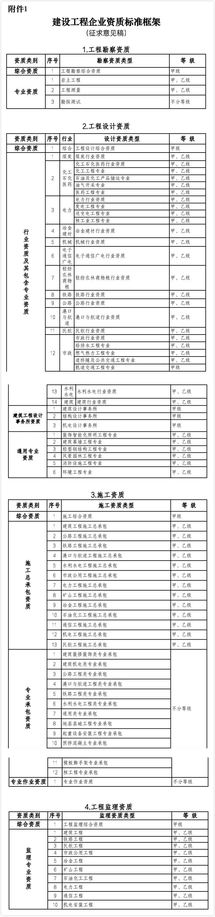 《建設工程企業資質標準框架(征求意見稿)》全文如下: