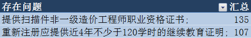 通過分析不符合條件人員的問題發現,存在“提供掃描件非一級造價工程師職業資格證書”、“重新注冊應提供近4年不少于120學時的繼續教育證明”這兩大問題的人員較多,分別為135人和107人,占所有不符合初始注冊條件人數的49.2%。