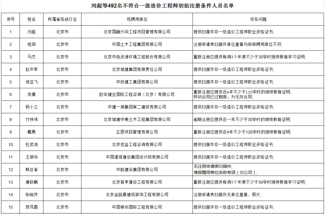 點擊圖片查看不符合一級造價工程師初始注冊條件人員及存在問題完整名單