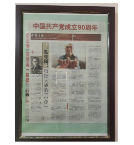 孔令科老人,1926年出生,1941年參軍入伍, 1946年加入中國共產(chǎn)黨,14歲加入新四軍,戎馬生涯中參加過抗日戰(zhàn)爭和解放戰(zhàn)爭,多次立下二等功。在講起那段槍林彈雨、戰(zhàn)火紛飛的革命年代時,他不免有些激動。令我們印象最深的是在戰(zhàn)爭中有五顆手榴彈滾到了他的腳下,幸運的是只有一顆爆炸了,導致右腿右臂受重傷,多處留有彈片。如今95歲高齡的孔老,身體硬朗、思維清晰,始終保持著每天讀書看報的好習慣,在靜享慢讀中,沉淀出生活的安靜與從容。如今的和平時代是無數(shù)革命先烈用鮮血和生命換來的,沒有他們浴血奮戰(zhàn),何來祖國今日繁榮昌盛?百年征程波瀾壯闊,百年初心歷久彌堅,祖國大地留下的是無數(shù)先輩們奮斗的足跡,流傳著感人肺腑的故事。臨走前,滿頭銀發(fā)的孔老不斷重復著:“你們生在好時代,大家都年輕,一定要多讀書多學習”。