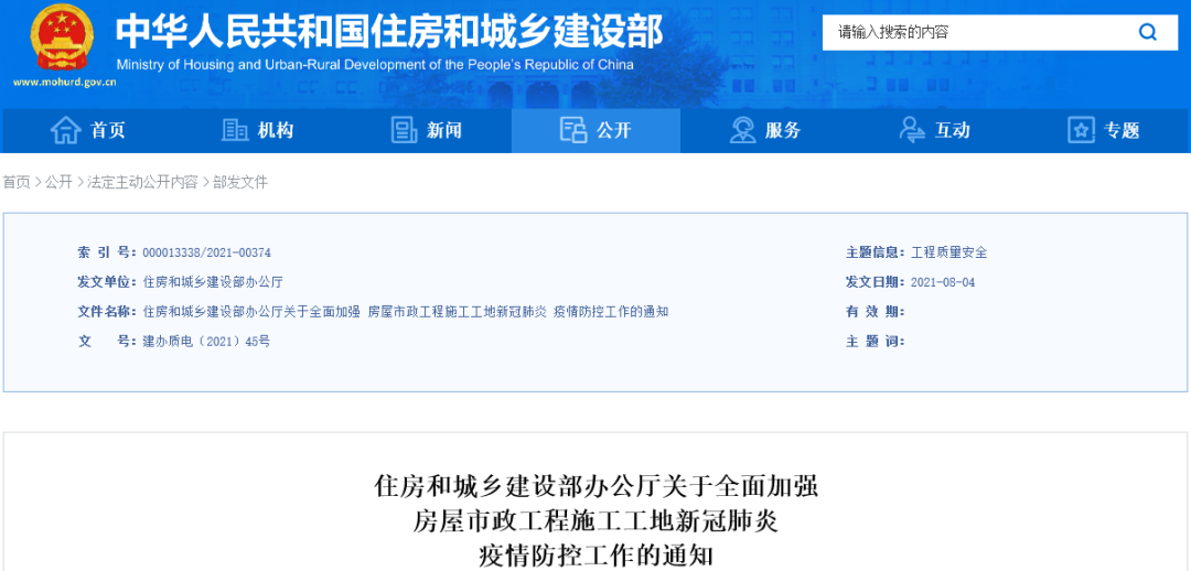 通知要求,各地住房和城鄉建設主管部門要提高政治站位,清醒認識施工工地疫情防控工作的嚴峻性、復雜性和重要性,認真貫徹落實疫情防控各項政策要求及疫情防控常態化措施,進一步健全施工工地疫情防控管理體系和疫情防控應急預案,做好應急物資儲備,隨時監控施工工地疫情變化,及時妥善處置突發事件,做到“早發現、早隔離、早治療”,堅決防止聚集性傳染、杜絕聚集性疫情事件。