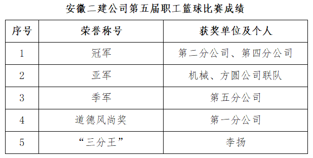 10月29日,隨著裁判的最后一聲哨響,為期三天的公司第五屆職工籃球賽結束全部賽程,完美收官。在公司領導的大力支持、所屬單位的積極配合,全體裁判員、運動員和工作人員的共同努力下,本屆比賽取得圓滿成功。各球隊秉承“友誼第一、比賽第二”和“重在參與、重在學習、重在提高”的原則,賽出了水平、賽出了風格、賽出了友誼,更賽出了二建職工團結一心、頑強拼搏、奮勇爭先的精氣神。