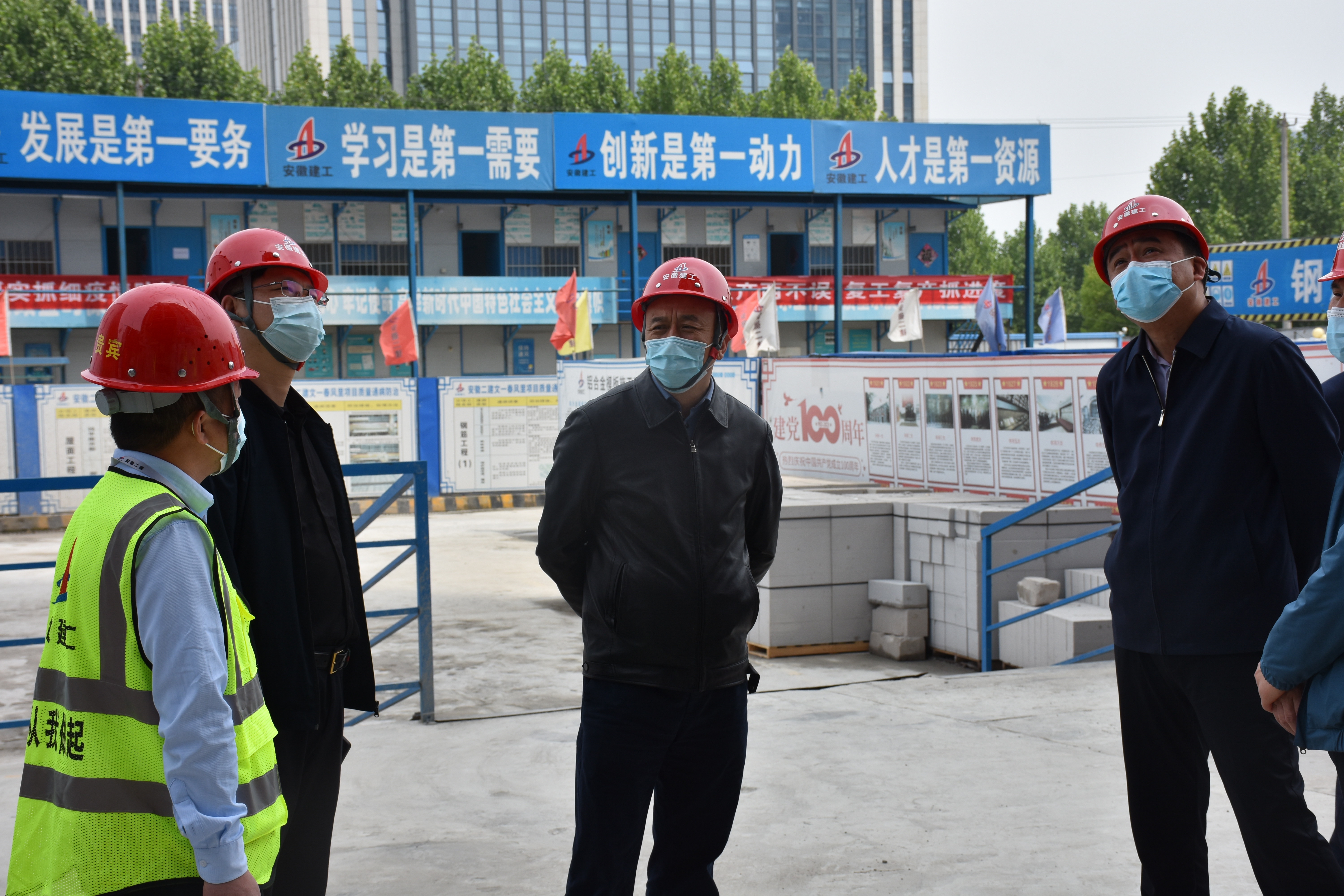 4月20日上午,建工控股黨委委員、紀委書記、監察專員王汪苗一行赴安徽二建文一春風里項目督導疫情防控工作,安徽二建黨委委員、副總經理葉和永,黨委委員、紀委書記沈壯參加督導。